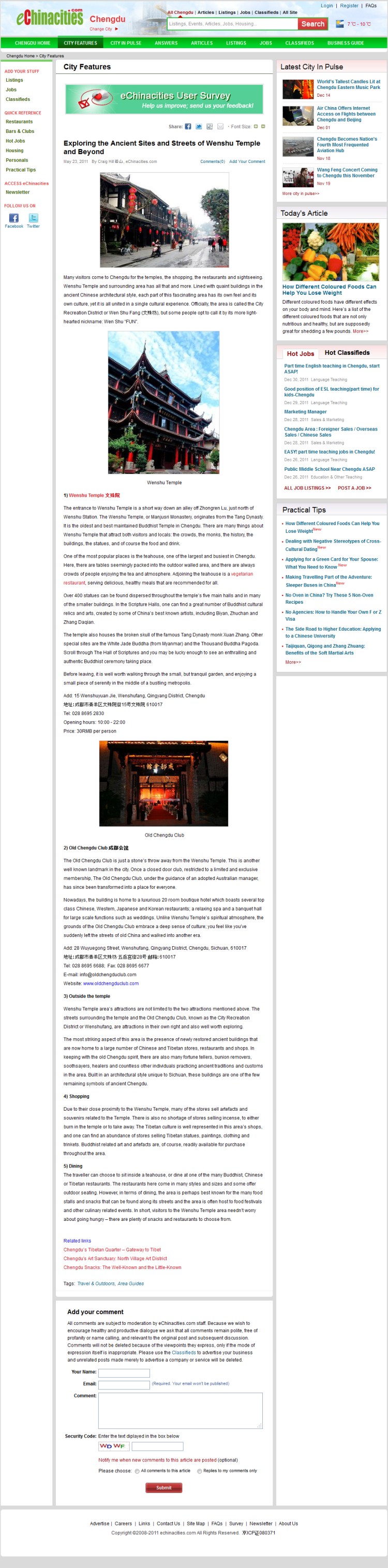 Many visitors come to Chengdu for the temples, the shopping, the restaurants and sightseeing. Wenshu Temple and surrounding area has all that and more. Lined with quaint buildings in the ancient Chinese architectural style, each part of this fascinating area has its own feel and its own culture, yet it is all united in a single cultural experience. Officially, the area is called the City Recreation District or Wen Shu Fang (文殊坊), but some people opt to call it by its more light-hearted nickname: Wen Shu “FUN”.