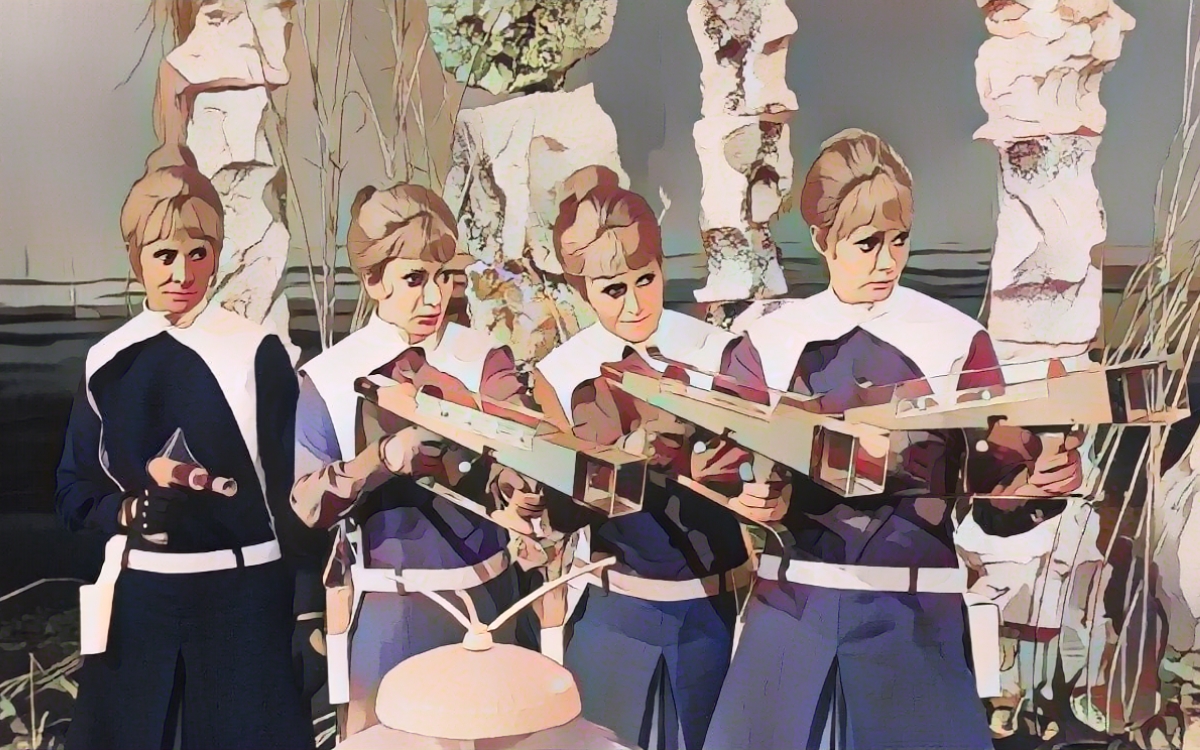 Armed soldiers rush in and drive the Chumblies away. The strangers are taken to a crashed ship and meet Maaga, commander of the Drahvins. She is a hard, disciplined women with cloned soldiers. Maaga says another race, the Rills, shot them down. The Chumblies are Rill servants. She claims the Rills are vicious and must be destroyed.