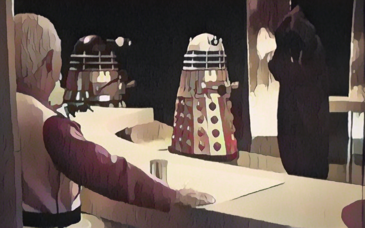 They set course for Earth to warn Space Security about the Dalek alliance and Mavic Chen’s treachery. Bret leads them to a contact, Daxtar, who seems friendly and offers help. As they talk, Daxtar slips and reveals knowledge he should not have: about the taranium core and the Daleks’ plan. Bret realises Daxtar serves Chen. A struggle breaks out; Bret shoots Daxtar to stop him raising the alarm.