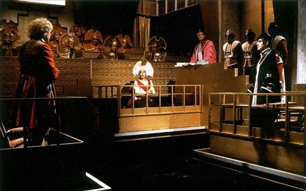 Events of the serial are framed on an arcing plot that carries through the other three serials of the 23rd season. In this, the Sixth Doctor is forced to land the TARDIS aboard a Gallifreyan space station, where he is brought into a courtroom. The Inquisitor informs the Doctor he is on trial for conduct unbecoming a Time Lord; evidence will be presented by the Valeyard.