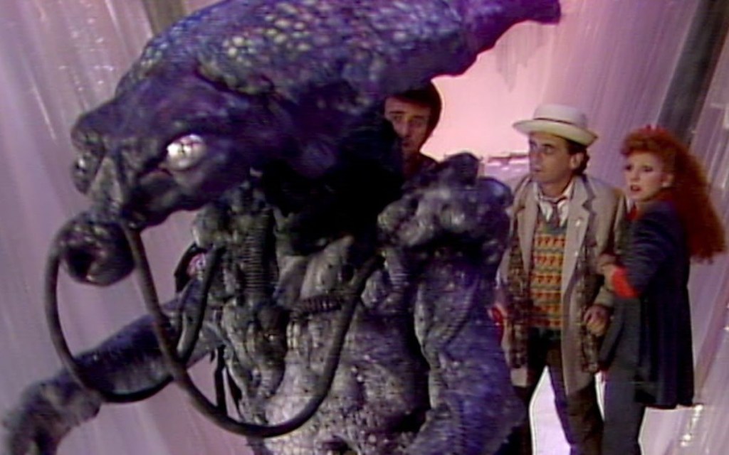 The Doctor and Glitz eventually encounter the “dragon”, which turns out to be a biomechanoid that can shoot lasers from its eyes. When Mel and Ace arrive and are pursued by Kane’s men, the “dragon” helps to protect the two and defeat the men. The “dragon” leads the four to a control room where it plays a holographic message.