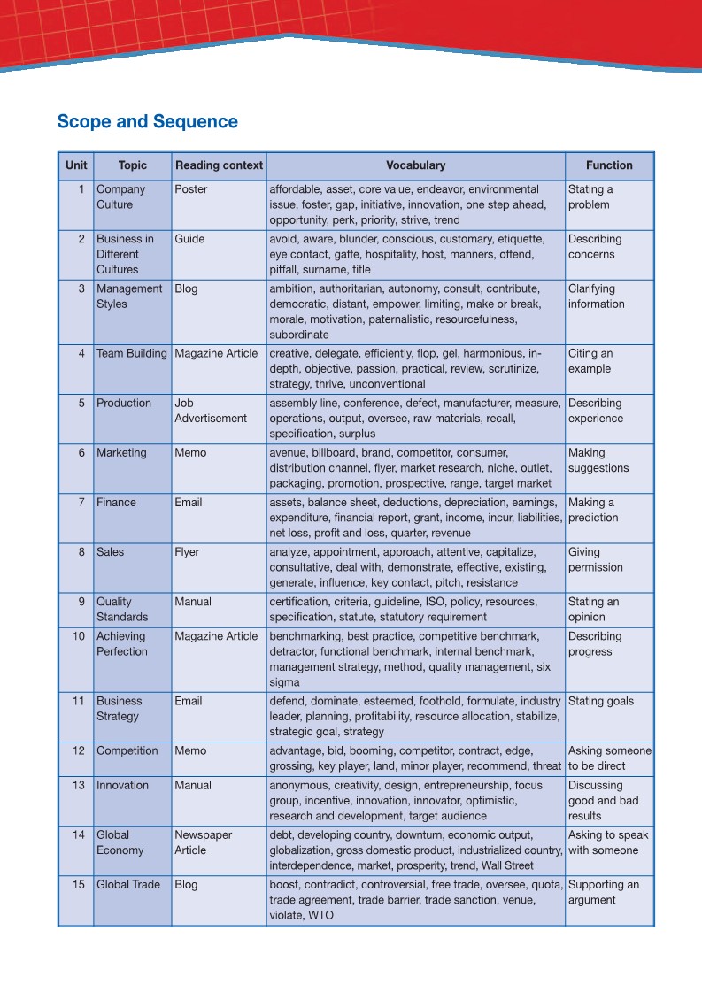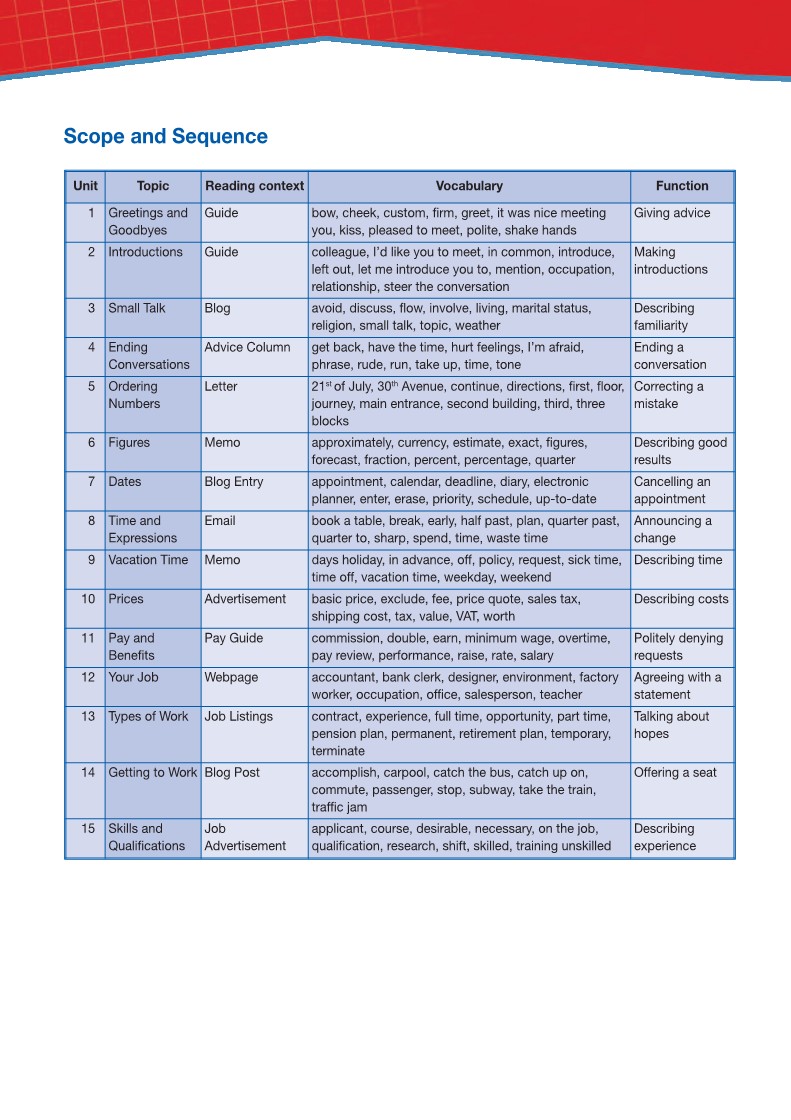 Business English is a new educational course for business professionals who want to improve their English communication in a work environment. Incorporating career-specific vocabulary and contexts, each unit offers step-by-step instruction that immerses students in the four key language components: reading, listening, speaking, and writing.