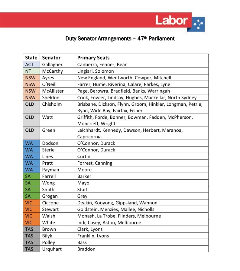 Labor Duty Senator List If you live in an electorate without a Labor MP, you can contact these Labor duty senators for help with any government matter. You can download a full list of the Labor Duty Senators’ emails and phone numbers by clicking on this link. labor-duty-senators-1Download Visit the Australian Book and Language Studio www.abls.com.au Share this: Email a link to a friend (Opens in new window) Email Print (Opens in new window) Print Share on Facebook (Opens in new window) Facebook Share on LinkedIn (Opens in new window) LinkedIn Share on X (Opens in new window) X Share on Pinterest (Opens in new window) Pinterest Share on Reddit (Opens in new window) Reddit Share on Tumblr (Opens in new window) Tumblr Like Loading...